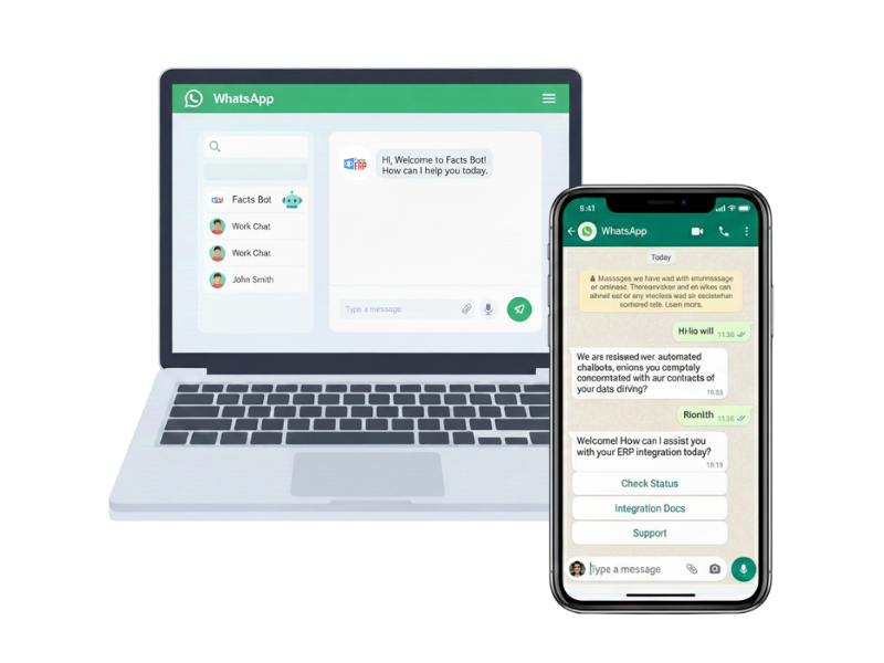 FactsERP connects directly with WhatsApp Cloud API to let customers, employees, and field teams interact with your ERP using the app they already use every day. No portals. No extra logins. Just fast, secure, real-time actions through WhatsApp.